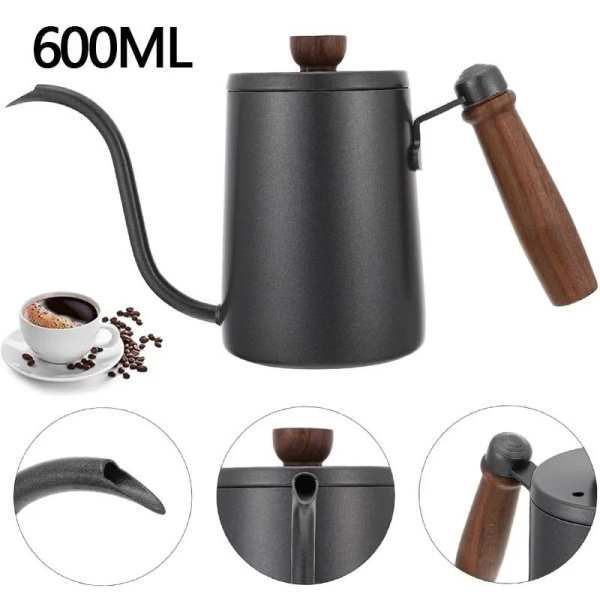 600ml Pour Over Coffee Kettle with Wood Handle Stainless Steel Hand Brewed Coffee Pot Goose Neck Design Home Use Perfect Gifts