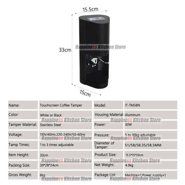 • 58.5mm Automatic Coffee Tamper Touchscreen Espresso Tamper 58mm Electric Tamper Adjustable 110-240V Flat or Tamp
